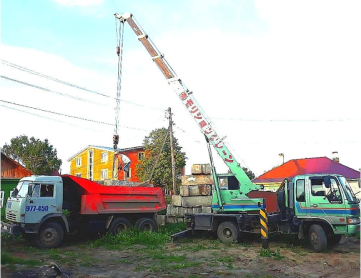 Разгрузка самосвала при строительстве дома автокраном 5тонн