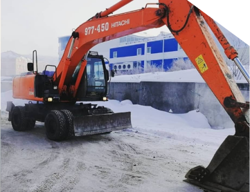 Уборка снега перед ледовым дворцом экскаватором Hitachi