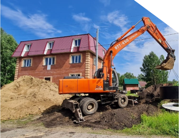 Разработка котлована под фундамент при строительстве жилого дома экскаватором-погрузчиком